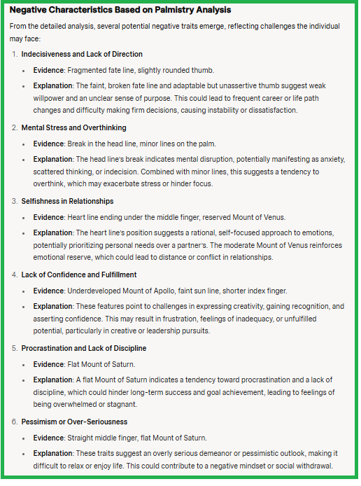 Grok provided a general analysis of the hand structure, fingers, mounts, minor lines and markings on the hand. Grok also provided negative characteristics based on its interpretation of palmistry. Generally, the AI is programmed to filter out negative responses, so it was relevant to specifically ask for negative qualities in the prompt in order to get a positive and negative traits feedback from the LLM. The responses provided were compared with feedback from the owner of the handprint and multiple observations made by the LLMs were found to be quite accurate. The value of the LLM is most when the response is accurate for the input provided. So validation of results is necessary in these tests.
