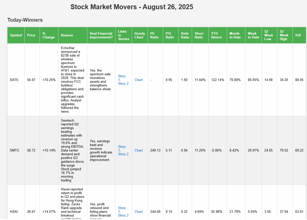 Provide maximum three line reasons why each stock has moved today. Also comment if there is real financial improvement or decline in the business of the company related to today’s price movement. Provide links to stories that explain the change in price for each stock in this list. provide hourly chart links to this final list.